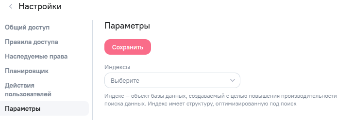 Настройка индексов выполняется в контексте каждой конкретной модели через интерфейс Настройки. Чтобы открыть интерфейс настройки, нажмите на кнопку в режиме редактирования выбранного объекта. В окне настроек перейдите в подраздел Параметры.