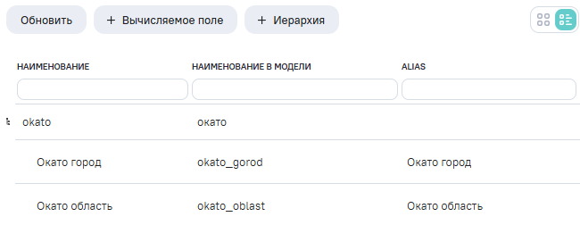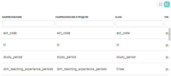 2.Таблица полей модели в режиме описания столбцов. В списке доступна сортировка и фильтрация. Чтобы выбрать поле, установите флажки напротив поля. Поля отобразятся в списке полей иерархии;
