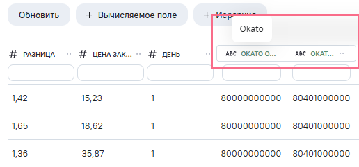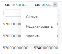 В нижней части экрана формы просмотра и редактирования моделей расположена область предпросмотра данных. Данная область содержит все столбцы, которые попали в модель. Справа от заголовка каждого столбца отображается кнопка , открывающая контекстное меню с пунктами Скрыть и Редактировать.