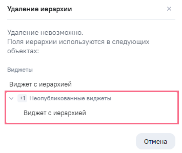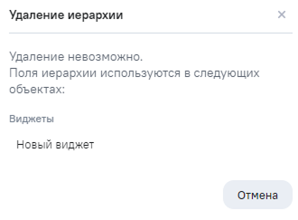 Если поле иерархии используется в виджете или поле иерархии выбрано для создания виджет-фильтров в информационной панели, то при удалении поля появится уведомление о невозможности выполнения действия.