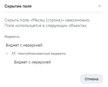 Если поле модели используется в виджете или поле выбрано для создания виджет-фильтров в информационной панели, то при скрытии поля появится уведомление о невозможности совершения действия. В уведомлении отображается список связанных объектов.
