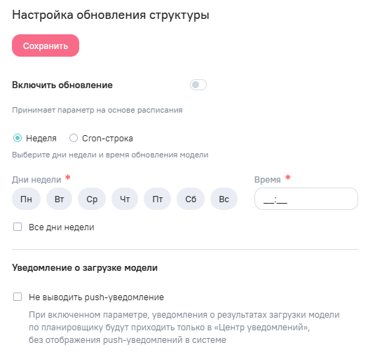 Автоматическое обновление структуры модели выполняется по планировщику на основе фиксированного расписания.