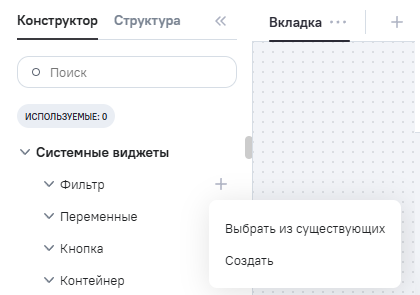 Для добавления нового виджета Фильтр нажмите на кнопку напротив блока Фильтр, и в выпадающем списке выберите пункт Создать.
