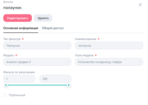 В просмотре фильтра можно ознакомиться с информацией на вкладке Основная информация и Общий доступ. В зависимости от права на фильтр в окне просмотра возможен переход в окно редактирования или удаления фильтра.