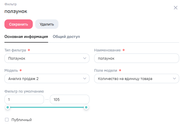 В редактировании фильтра можно внести изменения на вкладке Основная информация и Общий доступ. Для сохранения изменений необходимо нажать на кнопку