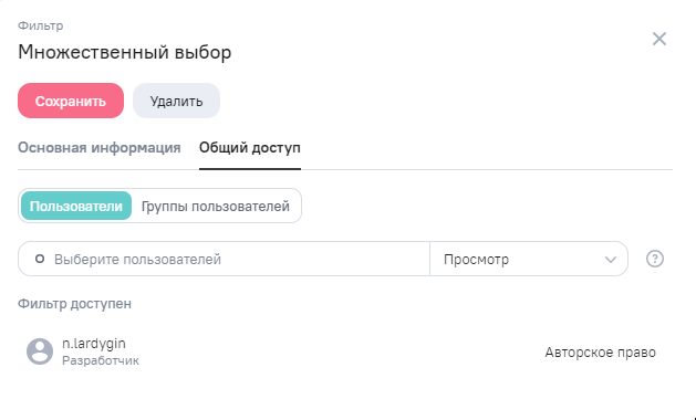 Пользователю на вкладке Общий доступ в окне редактирования фильтра доступно предоставление доступа к фильтру пользователю или группе пользователей.