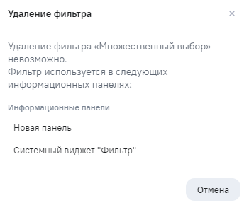Если фильтр и используется не только в текущей панели, при удалении в окне отобразится список других панелей. Для удаления необходимо удалить фильтр со всех панелей: