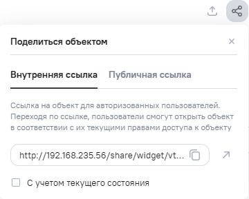 При нажатии на кнопку Поделиться откроется окно Поделиться объектом. Если в Системе включена возможность создания публичных ссылок, то в окне Поделиться объектов отображаются вкладки Внутренняя ссылка и Публичная ссылка. Иначе доступно только копирование адреса объекта.