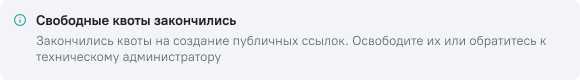 Возобновить публикацию - для снятой с публикации публичной ссылки. Если свободных квот на создание публичных ссылок нет, отобразится окно с информацией Свободные квоты закончились. Возобновление ссылки не приведет к изменению самой ссылки;
