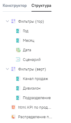 В режиме редактирования в области настроек на вкладке Структура расположен список виджетов (системных и аналитических) выведенных на активную вкладку панели. По умолчанию виджеты расположены в порядке добавления снизу вверх. С помощью перемещения виджетов на вкладке Структура возможно изменение позиции виджета: отображение сверху/снизу другого виджета. Если виджет типа Контейнер содержит в себе другие виджеты, то они отображаются в древовидной структуре.
