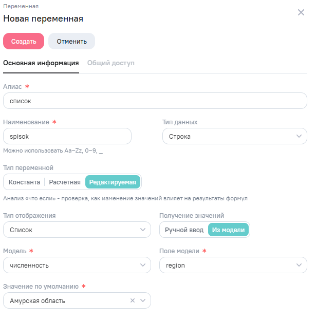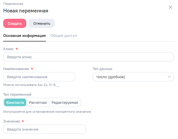 Откроется окно создания переменной. Окно состоит из двух вкладок: Основная информация и Общий доступ. Вкладка Общий доступ доступна только после заполнения полей на вкладке Основная информация и нажатия на кнопку Создать.
