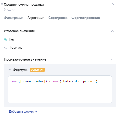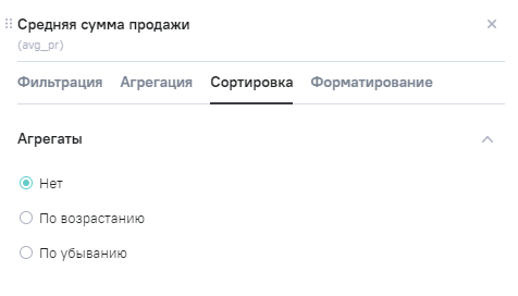 - настраивать агрегацию для полей выбранных в Агрегаты/Столбцы нажав на кнопку агрегации слева от наименования поля. При нажатии откроется список доступных агрегаций, который зависит от типа поля;