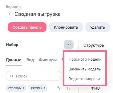 Настройка структуры виджета предполагает возможность изменения последовательности отображения колонок и группировки строк. Настроить структуру виджета можно следующими способами: