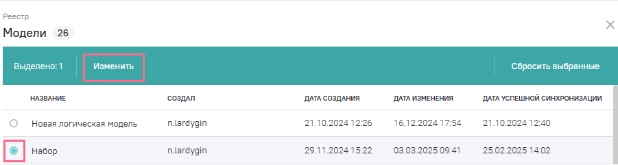 - Заменить модель - открывает окно со списком доступных для выбора моделей. Модель, которая на данный момент выбрана, расположена на первой строке и имеет индикатор активности;