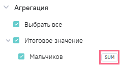 - блок Агрегация - содержит перечень настроенных агрегаций для итоговых и промежуточных значений по полям модели, включенным в виджет. У каждого поля, на котором настроена агрегация, справа отображается тег с информацией о настроенном типе агрегации по данному полю. При нажатии на тег открывается окно с настройкой агрегации.