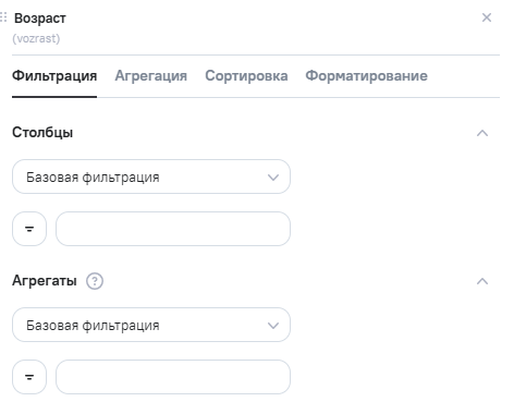 Агрегаты - отвечает за фильтрацию по агрегатам в столбце. Блок отображается, если по полю настроена промежуточная агрегация, по умолчанию свернут. Для выбора доступны два типа фильтрации: