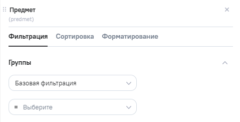Группы - отвечает за фильтрацию по данным в группировке. Вид фильтра зависит от типа поля и метки Является справочником(1). Для выбора доступны два типа фильтрации: