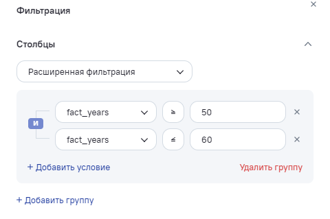 Столбцы - отвечает за фильтрацию по данным в столбце. Блок свернут, если нет заданы фильтры. Для выбора доступны два типа фильтрации: