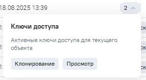 - Ключи доступа - список доступных ключей доступа на объект. Если объект создан данным пользователем указывается метка - Авторские права. При наличии нескольких ключей доступа отображается количество и кнопка