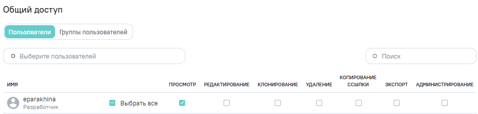 Добавленному пользователю сразу предоставляется право на Просмотр. Чтобы добавить дополнительные права, установите флажки в поля необходимых прав. Для установки всех прав воспользуйтесь флажком в поле Выбрать все.