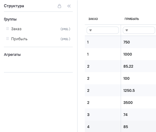 2.На вкладке Данные поля Orders (заказ) и Profit (прибыль) определены как Группы.