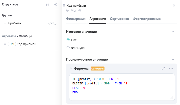 2.В Расчетные агрегаты добавлен новый агрегат Profit_cod (код прибыли), в Промежутоное значение указана формула IF [Profit] > 1000 THEN 'L' ELSEIF [Profit] < 500 THEN 'S' ELSE 'M' END.