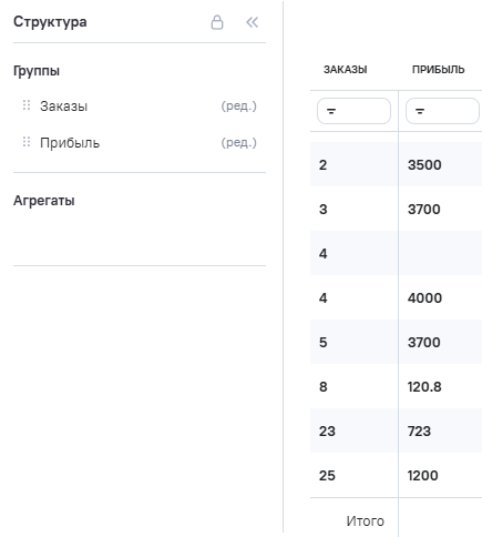 2.На вкладке Данные поля Profit (прибыль) и Orders (заказы) определены как Группы.
