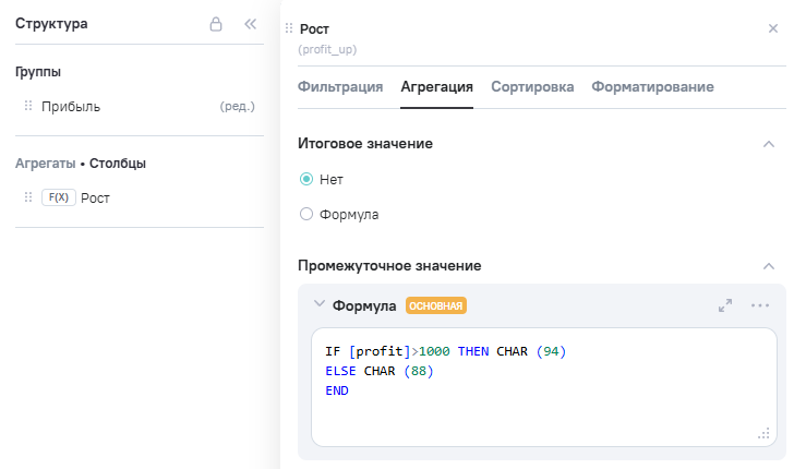 Profit_up (рост), в Промежутоное значение указана формула IF [profit] > 1000 THEN CHAR (94)(1) ELSE CHAR (88)(2) END.