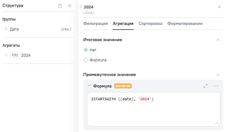 3.В Расчетные агрегаты добавлен новый агрегат Date_string (дата заказа), в Промежутоное значение указана формула CONCAT ('Дата заказа: ', [den], '.', [mesac], '.', [god]).