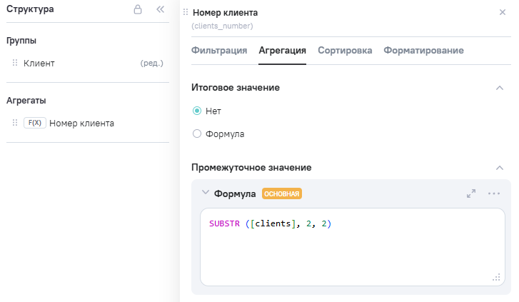 3.В Расчетные агрегаты добавлен новый агрегат Clients_number (номер клиента), в Промежутоное значение указана формула SUBSTR ([clients], 2, 2).