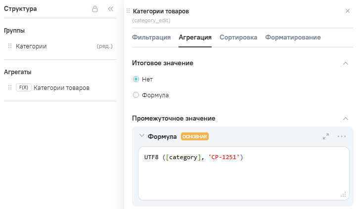 3.В Расчетные агрегаты добавлен новый агрегат Category_edit (категории товаров), в Промежутоное значение указана формула UTF8 ([category]).