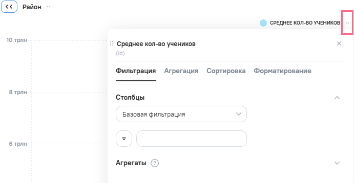 - настройка промежуточной и итоговой агрегации для показателей. Агрегация настраивается на вкладке Агрегация настроек поля. Промежуточную агрегацию также можно быстро изменить нажатием на иконку агрегации в структуре виджета. Подробнее об агрегации в разделе Параметры поля в структуре виджета;