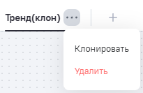 Для клонирования вкладки нажмите на кнопку svg у наименования вкладки и в открывшемся меню выберите Клонировать. В результате создается клон вкладки - в название подставляется (клон), все виджеты наследуются с вкладки оригинала и добавляются на вкладку клон, как экземпляр виджета.