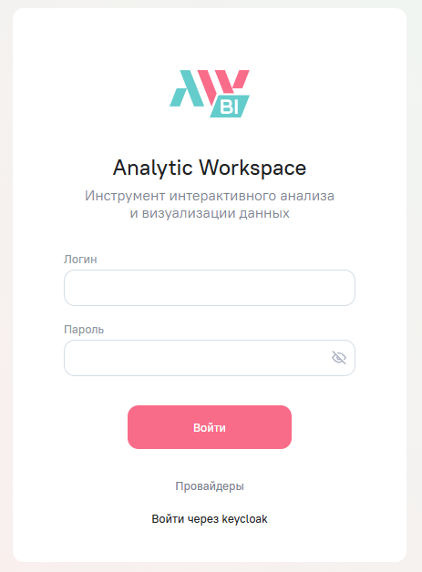 4. Пользователю на странице входа в приложение доступны кнопки для локальной аутентификации Войти или для аутентификации через LDAP сервер и входа через провайдер с типом OpenID в блоке Провайдер. При этом вход через кнопку локальной аутентификации Войти доступен: