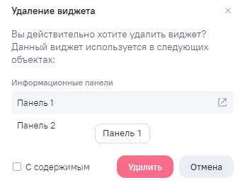 при отсутствии у виджета связанных объектов отобразится окно подтверждения удаления. Чтобы подтвердить действие, нажмите на кнопку