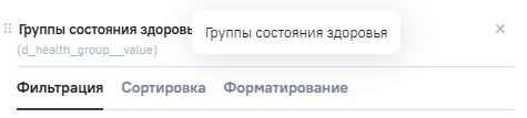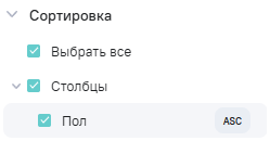 - блок Сортировка - содержит перечень полей и агрегаций данных по полям, для которых настроены правила сортировки. При наведении курсора мыши в строку записи поля, правее названия отображается информация о настроенном типе сортировки данных.