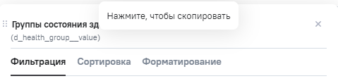 При наведении мышью на код поля - появляется всплывающее окно с текстом Нажмите, чтобы скопировать. Наименование кода поля отображается без сокращений.
