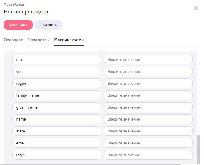 - Маппинг схемы - содержит интерфейс для задания правил сопоставления атрибутов пользователя (ролей) внешнего провайдера и атрибутов доступа (ролей) схемы.