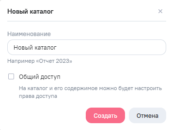 Создать каталог доступно создание нового каталога. У каталога с общим доступом отображается иконка Права доступа, при нажатии открывается окно для просмотра прав доступа к каталогу.