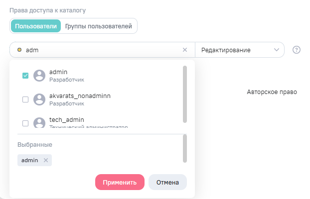 - право Редактирование - пользователи могут просматривать, изменять каталог и добавлять в него объекты;