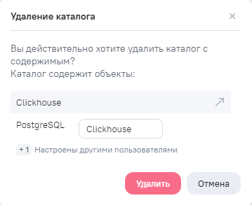 - Удалить - открытие окна подтверждения действия удаления каталога. Чтобы подтвердить действие, нажмите на кнопку Удалить, для отмены - нажмите на кнопку Отмена. Кнопка доступна, если выбран каталог с правом на администрирование.