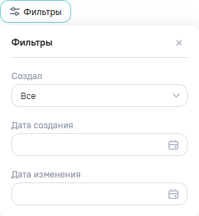Дата создания - фильтр по дате и времени создания источника данных, при фильтрации в реестре останутся объекты и каталоги, в которых находятся доступные для пользователя объекты, созданные в выбранную дату в фильтре;
