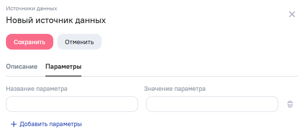 4.Вкладка Параметры - для реляционных баз данных параметры определяют параметры подключения к базе данных, для файловых источников - параметры обработки файлов, для самописных коннекторов с помощью JDBC - параметры, задаваемые разработчиками.