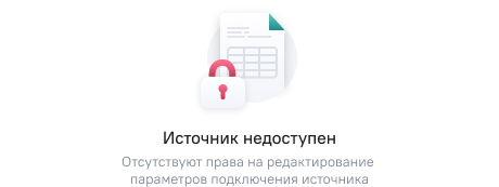 При переходе к редактированию источника, к которому у пользователя нет прав на редактирование отобразится надпись Источник недоступен. Отсутствуют права на редактирование параметров подключения источника..