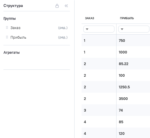 2.На вкладке Данные поля Orders (заказ) и Profit (прибыль) определены как Группы.