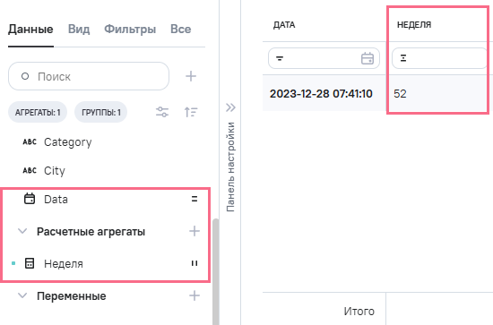 Week(номер недели), в Промежуточное значение указана формулаDATEPART ([data], "week"); -