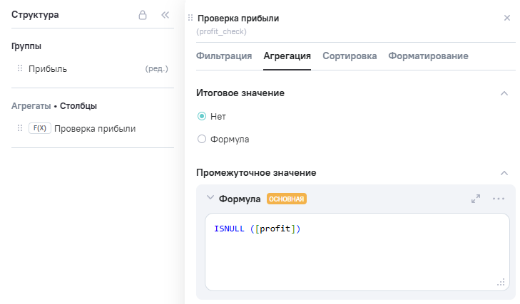 2.В Расчетные агрегаты добавлен новый агрегат Profit_orders (прибыль по заказу), в Промежутоное значение указана формула ZN ([profit]/[orders]).