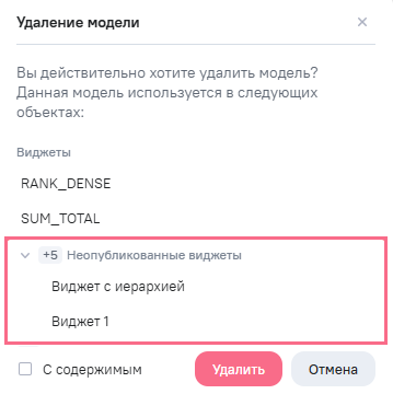 В режиме ручной публикации виджетов при удалении модели в списке объектов доступен отдельный блок Неопубликованные виджеты.