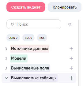 - Добавить JOIN - установка связи вычисляемой таблицы с другими блоками модели. Добавление связей доступно только в контекстном меню в области схемы модели;