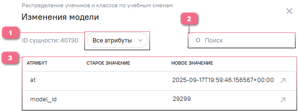 Пользователь Системы при наличии у него права на просмотр, редактирование и администрирование модели может посмотреть историю изменений по сущностям выбранного объекта. Такое право он по умолчанию получает на созданные им модели.